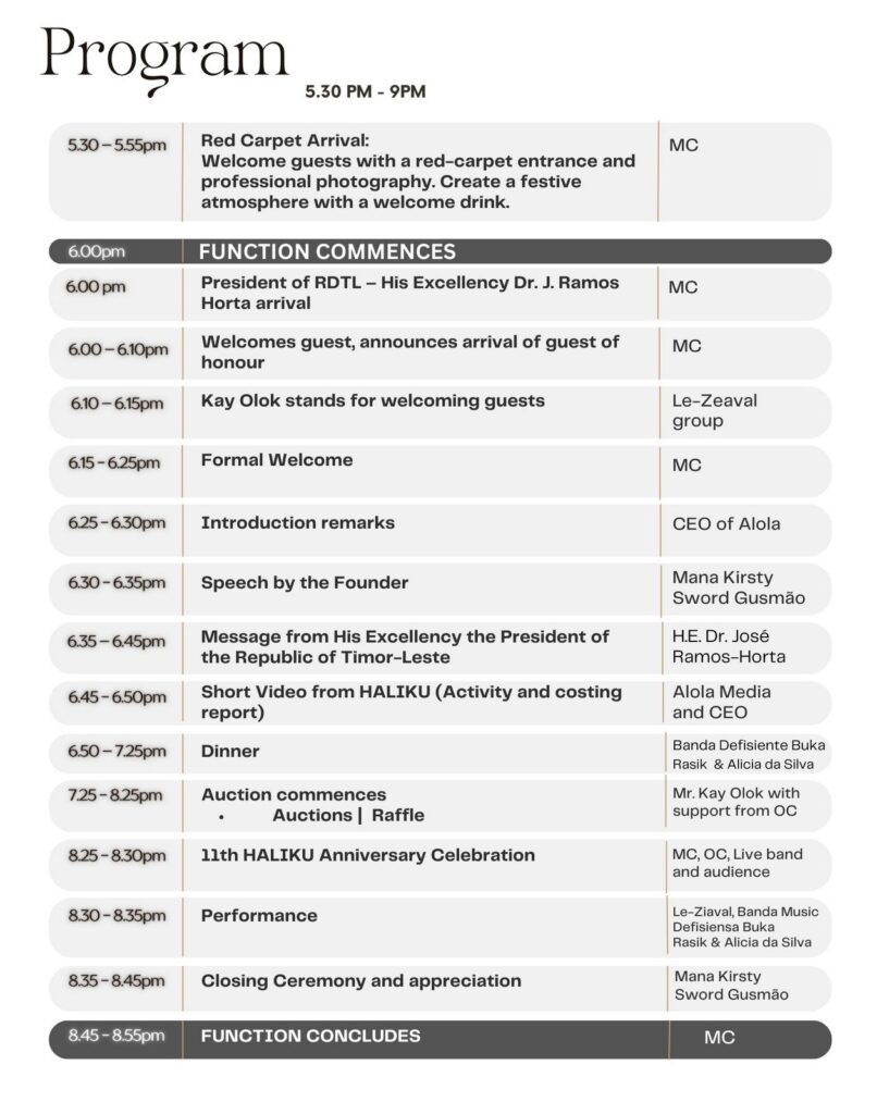 As a fundraising event, the 2025 HALIKU Gala Dinner with the theme “SHARE THE LOVE, SPREAD THE HOPE: TOGETHER WE FIGHT BREAST CANCER” – “Fahe Domin, Habelar Esperansa: Hamutuk ita kombate kankru susun.” will be a spectacular event in early March that will not only bring together diplomatic corps, businessmen, state apparatus and several other important people at the Lahane state palace but also as an event that provides an opportunity for all parties to contribute to the continuation of a program that is so touching the lives of women diagnosed with cancer, a disease that threatens us all.