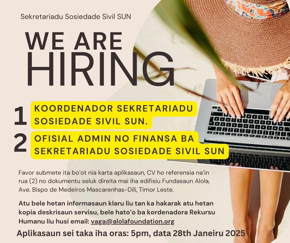 - Ofisial Admin no Finansa ba Sekretariadu Sosiedade Sivil SUN. (Durasaun tempu servisu Fulan 6 (Periodu fixu))